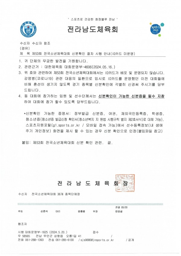 제53회 전국소년체육대회 신분확인 절차 시행 안내(ID카드 미운영)